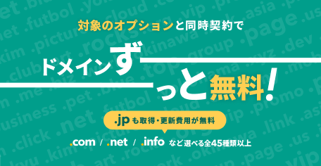 メールアドレスやホームページを簡単に作成できる「ムームーサーバー」を対象ドメインの取得と一緒にご契約いただいた場合、ドメインの取得費用と更新費用が0円になります。